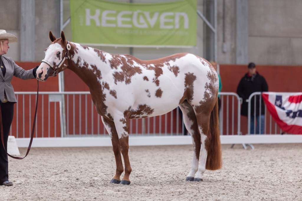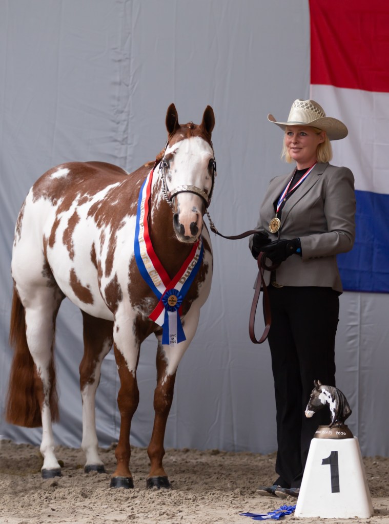 Dit is onze mooist getekende paint merrie Flower zij is een dochter van de meervoudig Europees kampioen Silver Flower. Haar moederlijn gaat terug op wereldberoemde Halter en pleasure paarden. Flower zal zo’n 1.60m worden ze heeft een heerlijk karakter super gangwerk en is heel intelligent. Ze heeft als 2 jarige haar eerste APHA punten behaald. Ze was Nederlands kampioen halter en Color Class in 2019 en 2020 , in 2023 zal zij een veulen van A Radical Intimidator krijgen. ( 1 van de laatste in NL) Inmiddels heeft zij haar Rom in de Halter amateur en in de color class